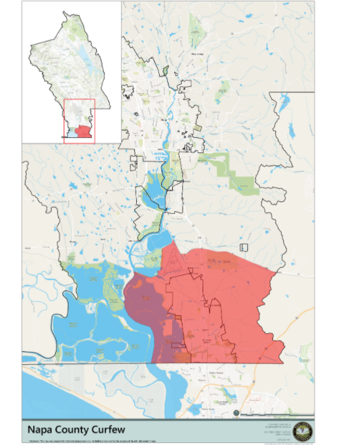 In Napa County, a curfew has been called between 8 p.m. and 5 a.m. for unincorporated Napa County from State Highway 29/State Highway 12 — Jameson Canyon Road — and all areas south — including the city of American Canyon — east and west to the Napa County Line.