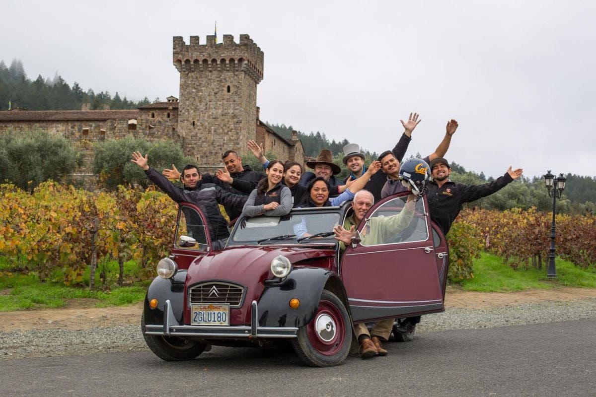 NAPA VALLEY, CA – PHOTO: Dario Sattui (in driver’s seat holding Cal helmet) and his team are serious about ridesharing. His Citroen 2CV which was originally designed to hold 2 farmers and haul 50 kilos of potatoes at 30 mph has been selected as the rideshare vehicle of choice for his enthusiastic employees.