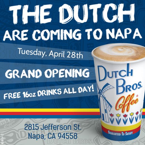 Dutch Bros. Coffee Napa will celebrate its grand opening Tuesday -- April 28 -- with free 16-ounce drinks all day from 5:30 a.m. to 10 p.m.