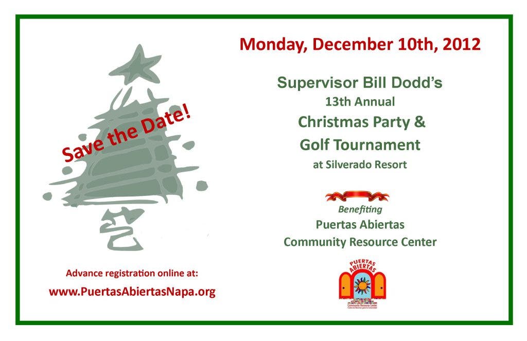 As has become tradition in Napa Valley, Supervisor Bill Dodd will host his 13th Annual Christmas Party & Golf Tournament. The evening Christmas party features fine wines, dinner, plus a live and silent auction. All proceeds will benefit Puertas Abiertas Community Resource Center.