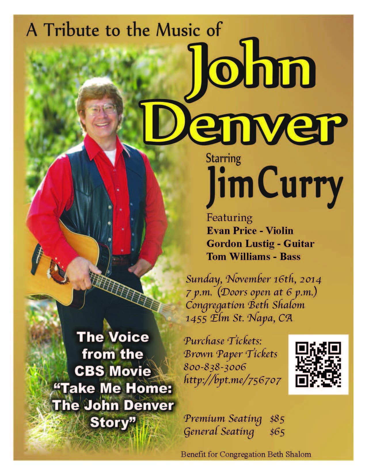 A Tribute to the Music of John Denver, starring Jim Curry, featuring Evan Price, Gordon Lustig and Tom Williams, will be performed on Sunday, November 16th, 2014 at 7 p.m. (doors open at 6 p.m.), at 1455 Elm St., as a benefit for Congregation Beth Shalom, Napa.