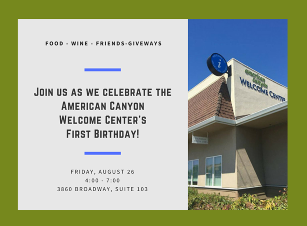 AMERICAN CANYON, CA – The American Canyon Chamber of Commerce is celebrating its American Canyon Welcome Center's 1st Birthday Party Friday, Aug. 26, at the center at 3860 Broadway Street #103, American Canyon.