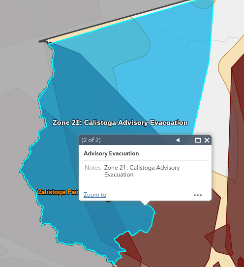 The advisory for Calistoga and surrounding area is "the only evacuation advisory in Napa County at this time." No updates until the morning.