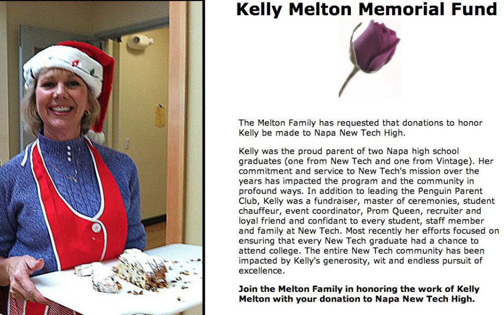 At her family's request, a memorial fund to benefit New Technology High School has been created to honor the life of Kelly Melton, the late wife of Napa police chief Richard Melton and mother of two sons who attended local schools.