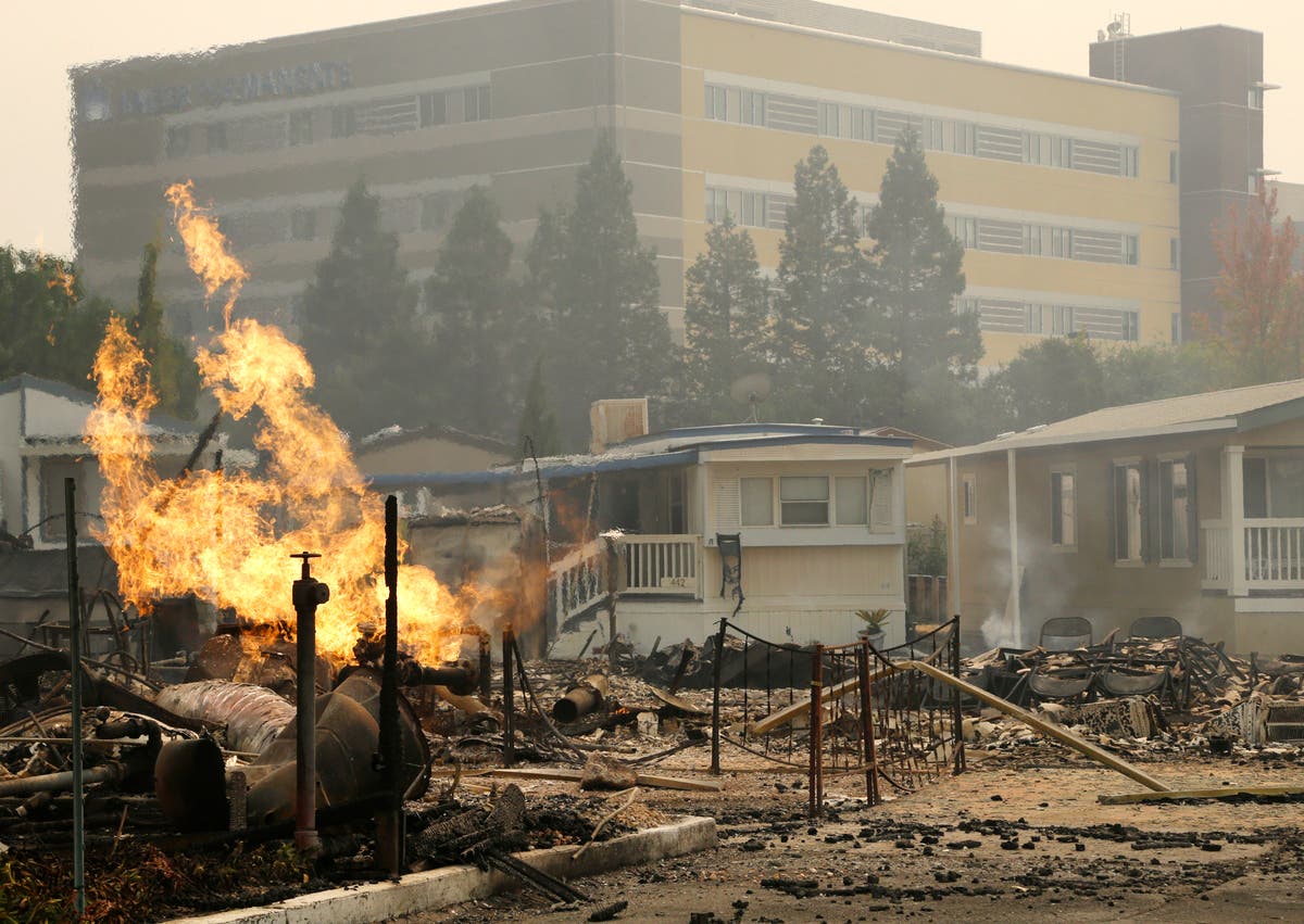 Photo: Flame from an open gas valve burns at the Journey's End mobile home park on Monday, Oct. 9, 2017, in Santa Rosa, Calif. Wildfires whipped by powerful winds swept through Northern California, sending residents on a headlong flight to safety through smoke and flames as homes burned. (Ben Margot/Associated Press)