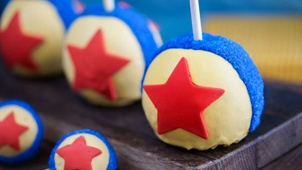 · Pixar Ball Apple (Available starting June 23) – Dipped in yellow chocolate, this candy apple is striped with blue chocolate and blue sugar and topped with a fondant star.