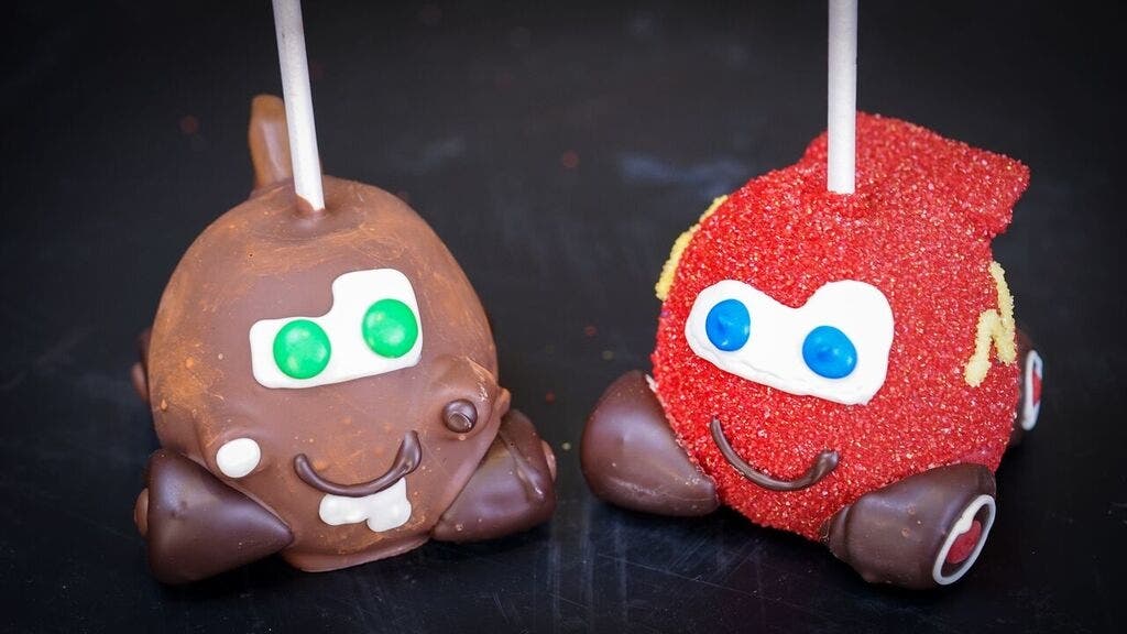 · Tow Mater Apple (Available through June 22) – Just towed in, this candy apple is dipped in milk chocolate, dusted in orange powder, and decorated with mini-marshmallow headlights, chewy chocolate candy, marshmallow wheels, white and dark chocolate, and small round candy-coated chocolates.