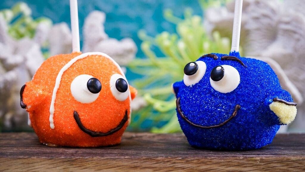 · Dory Apple – Just keep swimming to find this candy apple dipped in white chocolate, covered in blue sugar, and decorated with hand-cut marshmallows, yellow sugar, white and dark chocolate, and small round candy-coated chocolates