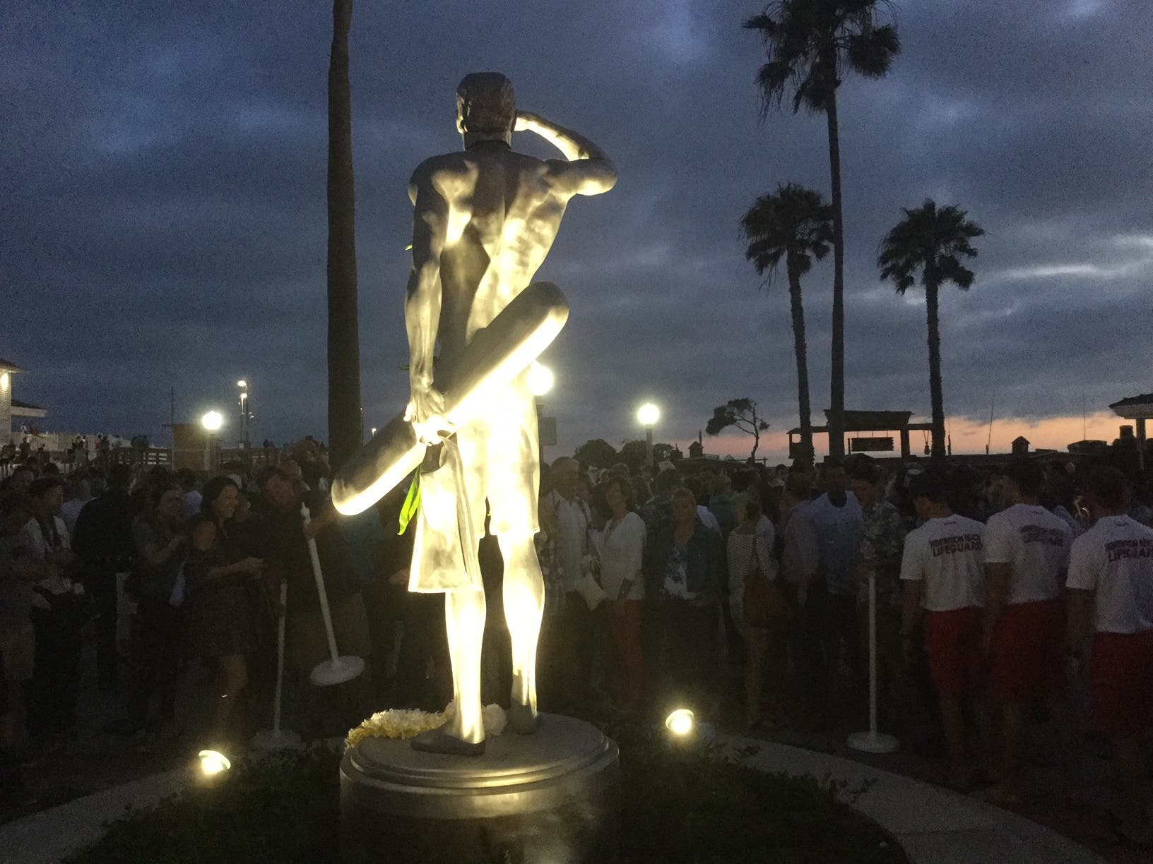 There, a crowd of over 2,500 residents, city staff, lifeguards and honorary attendees was present to see the unveiling of Jake Janz's 9-foot tall sculpture honoring Newport Beach's fallen lifeguard. A solemn scene with the ocean breezes, the flag draped above the covered statue.