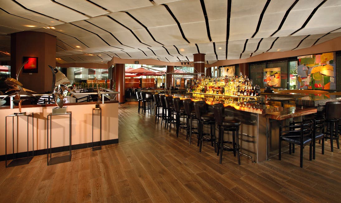 Among the new touches are an expanded 360 degree bar with a lighted onyx top; new booths and sofas featuring a contemporary charcoal fabric; stained and whitewashed wide plank oak flooring; sleek steel topped hostess stand; remodeled bathroom interiors including marble countertops, chrome fixtures and designer wallpaper; and a new color palette of muted earth tones and charcoals lending the perfect backdrop to the newly installed contemporary art exhibit.