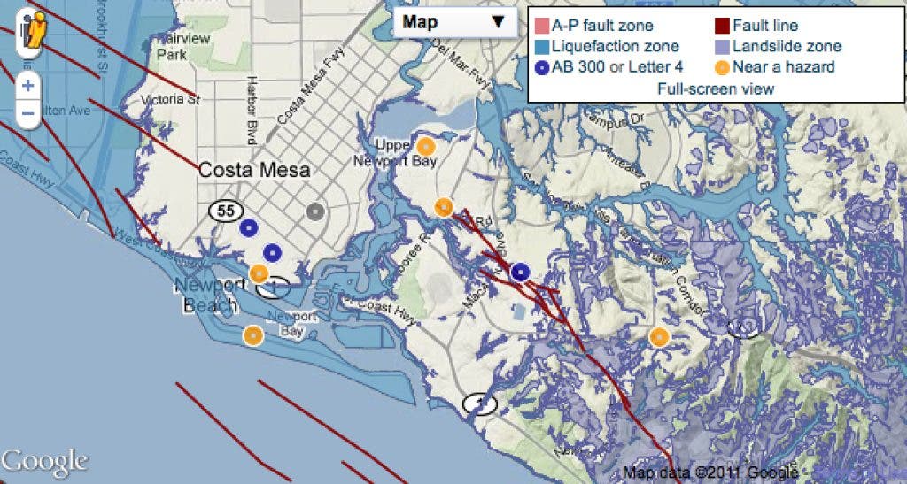- Corona del Mar High School scores a triple bonus. It's within a quarter-mile of a landslide zone, a liquefaction zone and a U.S. Geological Survey fault line.