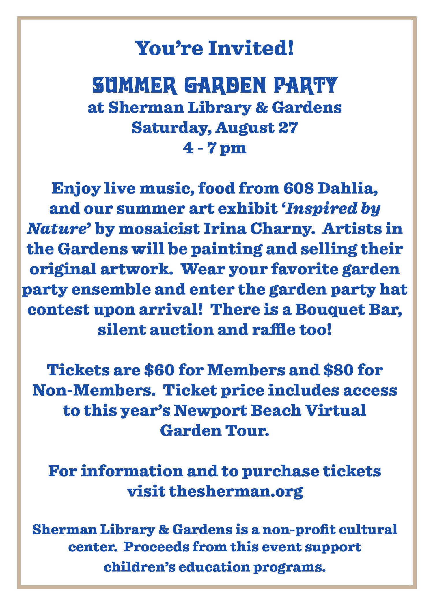 CORONA DEL MAR, CA — Sherman Library & Gardens in Corona Del Mar is hosting a "Summer Garden Party" Saturday, Aug. 27 from 4 p.m. -7 p.m., and reservations are underway.