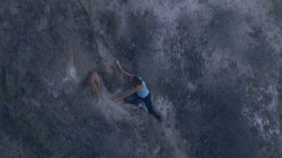 The woman had climbed down to where the dog was stuck and both ended up stranded on a steep ledge more than 50 feet up until a firefighter rappelled down to their location, fitted the woman with a harness and all three were hauled to safety.