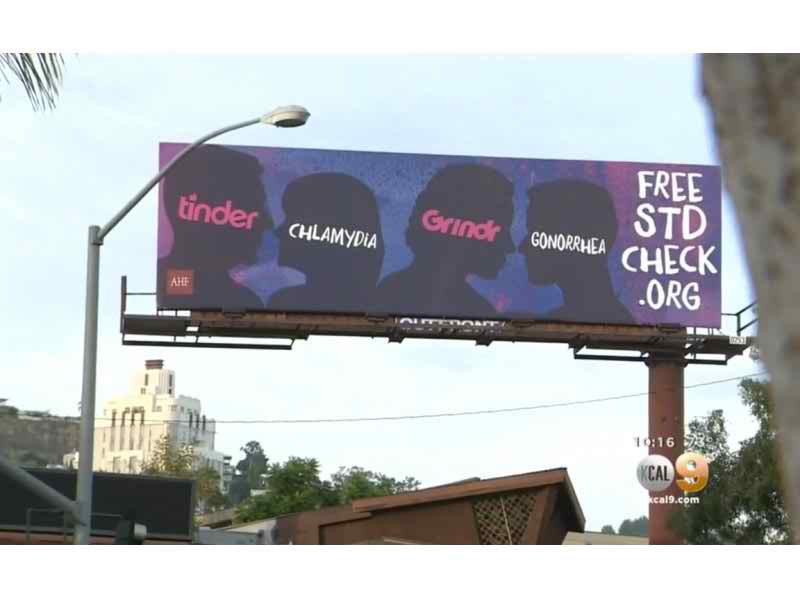 The AIDS fighting group has put up billboards near Tinder’s West Hollywood headquarters, linking casual hookup apps to the increased spread of chlamydia and gonorrhea.