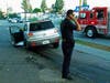 At 7:15 a.m. Sunday, a caller alerted the Los Angeles Police and Fire Departments about a traffic incident with "city property involved" that occurred at the intersection of Lankershim Boulevard and Erwin Street in North Hollywood. An out-of-control car had sheared a fire hydrant and also knocked down what appeared to be pipe that fed telephone lines to nearby businesses.
