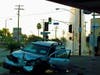In the impact with the curb, the vehicle lost the front driver's side wheel, then slid with momentum onto the northwest corner of the intersection and stopped its travel in the lot of a drive-through dairy store. Fortunately, the dairy store was not yet open for business. The car's airbags had deployed, and the driver's side door was left open.