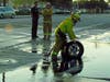 The fire crew jumped out of the trucks and assessed the situation, and with a few tools, the crew quickly shut down the tall plume of water blasting out from the damaged fire hydrant base.
