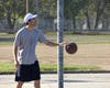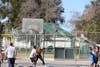 Next to the soccer-tennis game, a group of men are in the middle of a heated basketball game. Extra players sit on benches and switch out tired players as the game progresses. A solo tennis player practices on a handball court.