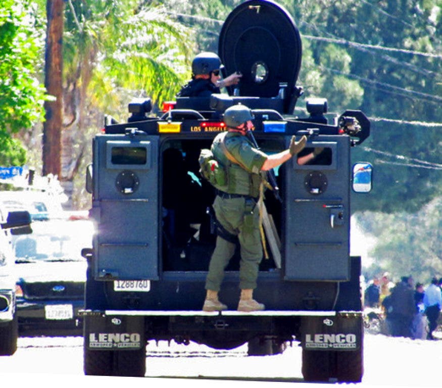 An LAPD helicopter is now over the scene, and has spotted the suspect vehicle driving away from the area. The LAPD air crew observes the vehicle and sees a gunman point his weapon outside the vehicle window. Then the gunman is observed firing into buildings, as the vehicle drives through a neighborhood.