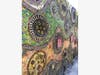 What was once a non-descript sidewalk and a blank concrete wall gets frequent traffic now as people come to see a spectacular 8-foot high, 45-feet-long abstract mural made up of thousands of recycled Sierra Nevada beer and LeCroix soda cans, CD’s, hex nuts, 150 feet of rope lighting, miscellaneous hardware and tools, 200 pounds of scrap metal, broken mirror pieces, children’s toys, electronics, computer parts, pennies and other discarded items.
