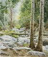 First Place artist, Christina Lynn Johnson, a versatile painter and fused glass artist from West Hills, is showing both her unique glass pieces, “Amber Onyx,” and a watercolor painting titled “Streambed at Switzer’s Camp.” Johnson enjoys the contrast of her experimental, abstract, glass pieces compared to the more traditional watercolor paintings and the richly blended colors of her dye-on-silk paintings. This is the second year in a row that she has won First Place in the Favorite Artist Awards.