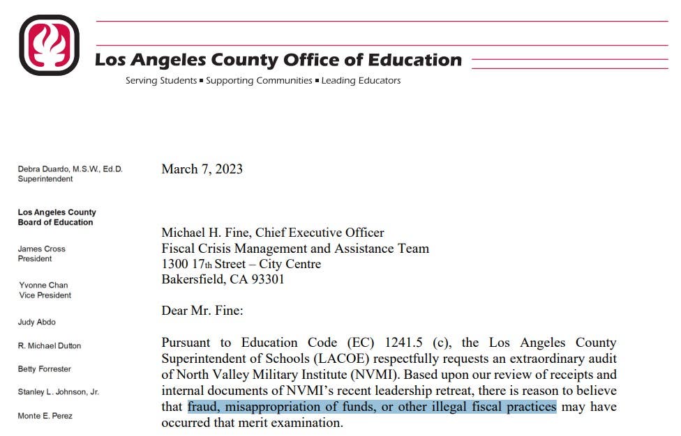 A newly obtained letter from the Los Angeles County Office of Education (LACOE) reveals that Dr. Ryan and other members of NVMI management may be facing much bigger problems. On March 7, 2023, NVMI’s regulators requested that the Fiscal Crisis Management and Assistance Team (FCMAT) conduct “an extraordinary audit” of the charter school. The basis for this request was a “review of receipts and internal documents of NVMI’s recent leadership retreat” that indicated “there is reason to believe that fraud, misappropriation of funds, or other illegal fiscal practices may have occurred”.