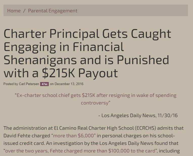 It should be noted that 88.3% of NVMI’s student body is Socioeconomically Disadvantaged, five percent of the students are homeless, and 15.8% are English Language Learners. LACOE suspects that “LCFF [Local Control Funding Formula] monies were used to fund all other associated costs of the retreat, including banquet room rentals, hotel rooms, animal boarding and care, and food and beverages for staff and their guests.” This would mean that state funds were diverted from educating students that are English learners, eligible for free or reduced-price lunch, and/or are foster youth. Instead, the money was used for the benefit of adults.