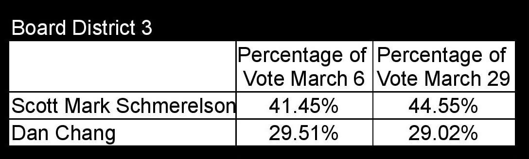 In BD3, Schmerelson has maintained the lead throughout the counting process and increased his margin of victory since the first tally but still did not earn enough votes to avoid a runoff. To secure re-election he must find a way to convince enough supporters of the eliminated candidates to vote for him instead of Dan Chang.