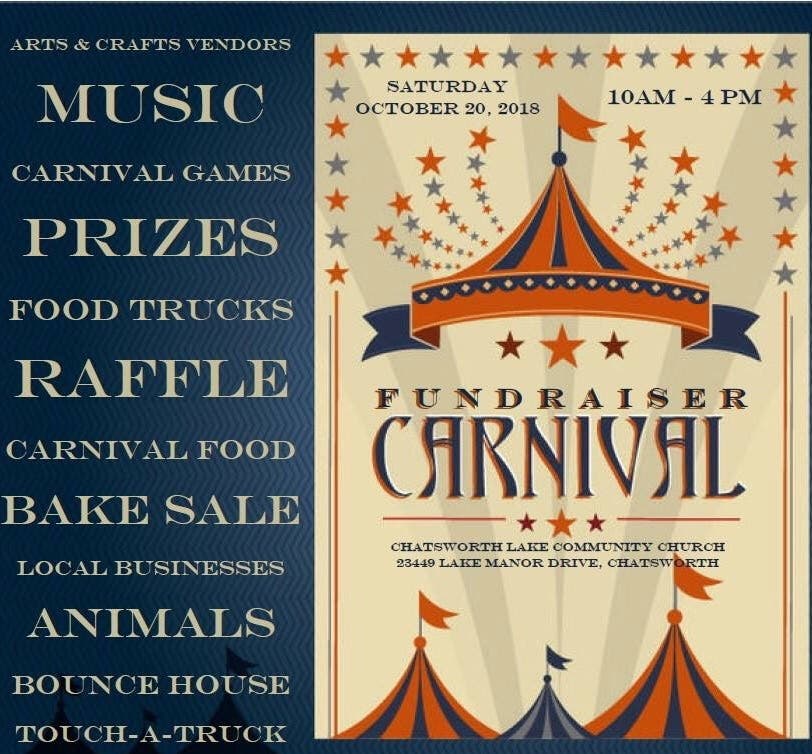 Beautiful CHATSWORTH LAKE CHURCH is the site of a hometown, family style CARNIVAL this Saturday, October 20 from 10-4!