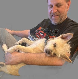 The actual story may be even more endearing. The dog was not Scott’s but was his neighbor’s and he was watching the pup while she was on vacation. Concerned that the dog was showing distress at being in an unfamiliar location, he let it crawl up on his lap.
