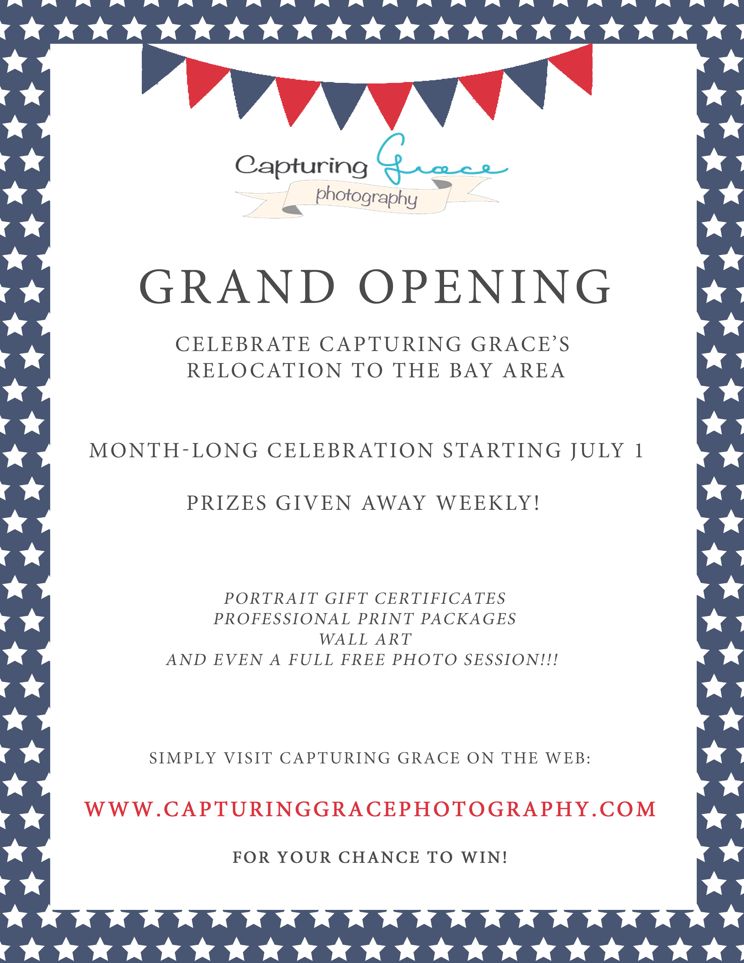 I am holding a Grand Opening for the entire month of July to help spread the word about my arrival with some wonderful giveaways. Please visit me on the web at http://www.capturinggracephotography.com