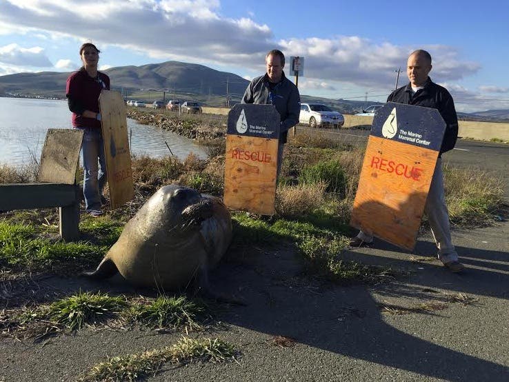 A 500-pound elephant seal is safe Monday night thanks to the combined work of Marin Mammal Center officials, the CHP and the U.S. Fish and Wildlife Service during an exciting afternoon on a local roadway, officials report.