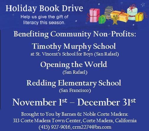 Holiday Book Drive recipients throughout the country include schools, libraries, literacy organizations, family social service agencies and homeless centers. This year, the Corte Madera Barnes & Noble, located at 313 Corte Madera Town Center, Corte Madera, CA 94925 will be collecting books for three Bay Area organizations: Timothy Murphy School at St. Vincent’s School for Boys in San Rafael, Redding Elementary School in San Francisco, and Opening the World in San Rafael.