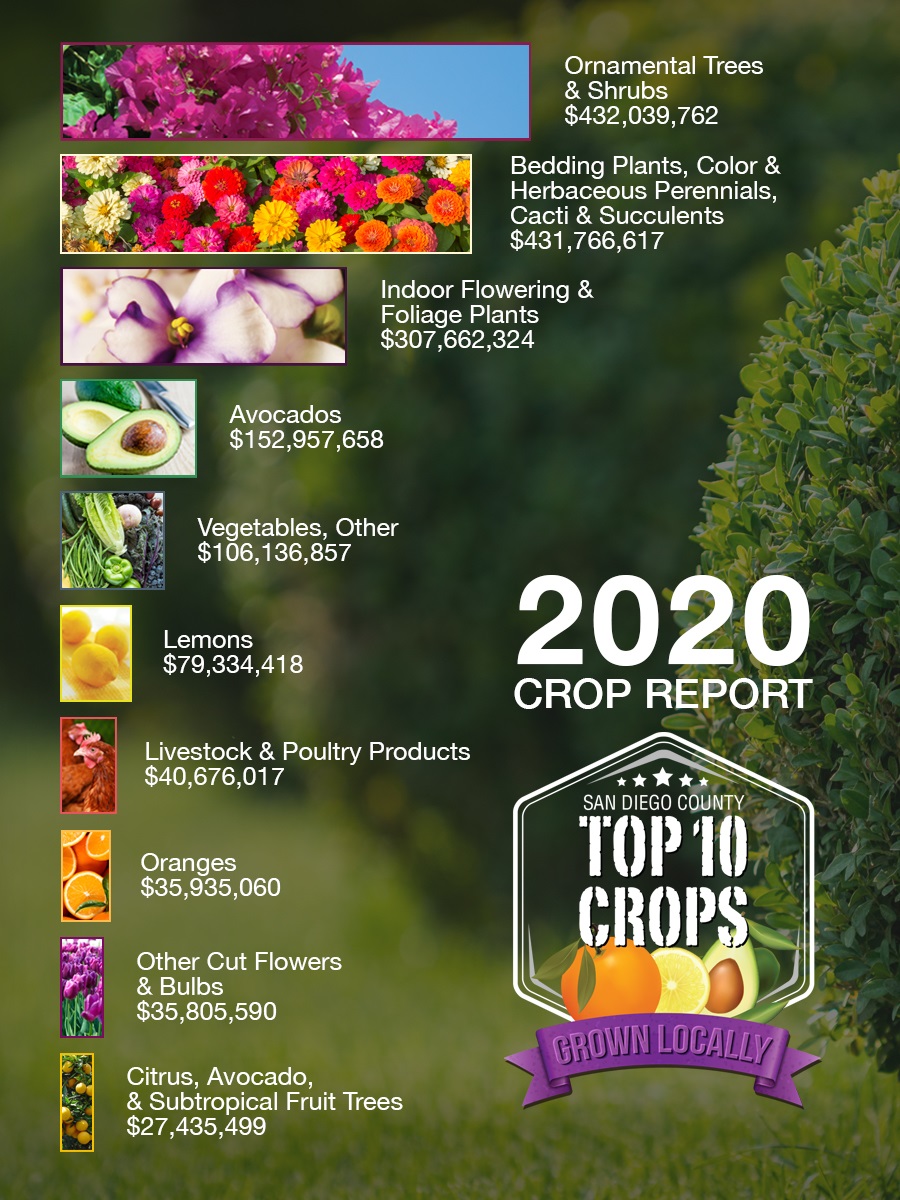 San Diego County’s most well-known crop, Avocados, remained in fourth place on the Top 10 list, increasing in value in 2020 by 9.2%, from nearly $140 million to nearly $153 million, after increasing nearly 16% in 2019.