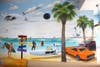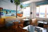 The décor is pure 1980s, complete with vinyl records and surfboards.
