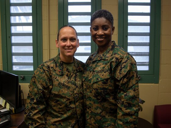 U.S. Marine Chief Warrant Officer 4 Karen Dymora, left, the commanding officer of the Marine Corps Base Camp Pendleton Brig, poses next to Chief Warrant Officer 4 Denise Barnes, the corrections policy officer with Headquarters Marine Corps, after being promoted to chief warrant officer four on Camp Pendleton, California, Feb. 10, 2020. Dymora made history by becoming the first female commanding officer of the Camp Pendleton Brig. Her new rank insignia was pinned on her uniform by Barnes, her mentor and friend of nearly 23 years, and the only other female chief warrant officer four in the corrections military occupational specialty.