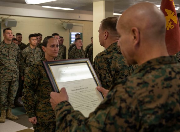 U.S. Marine Sgt. Maj. Hector Ortiz, the sergeant major of Security and Emergency Services Battalion, Marine Corps Installations West, Marine Corps Base Camp Pendleton, reads a promotion warrant to Chief Warrant Officer 4 Karen Dymora, the commanding officer of the Marine Corps Base Camp Pendleton Brig, prior to her being promoted on Camp Pendleton, California, Feb. 10, 2020. Dymora made history by becoming the first female commanding officer of the Camp Pendleton Brig. Her new rank insignia was pinned on her uniform by her mentor and friend of nearly 23 years, Chief Warrant Officer 4 Denise Barnes, the only other female chief warrant officer four in the corrections military occupational specialty.