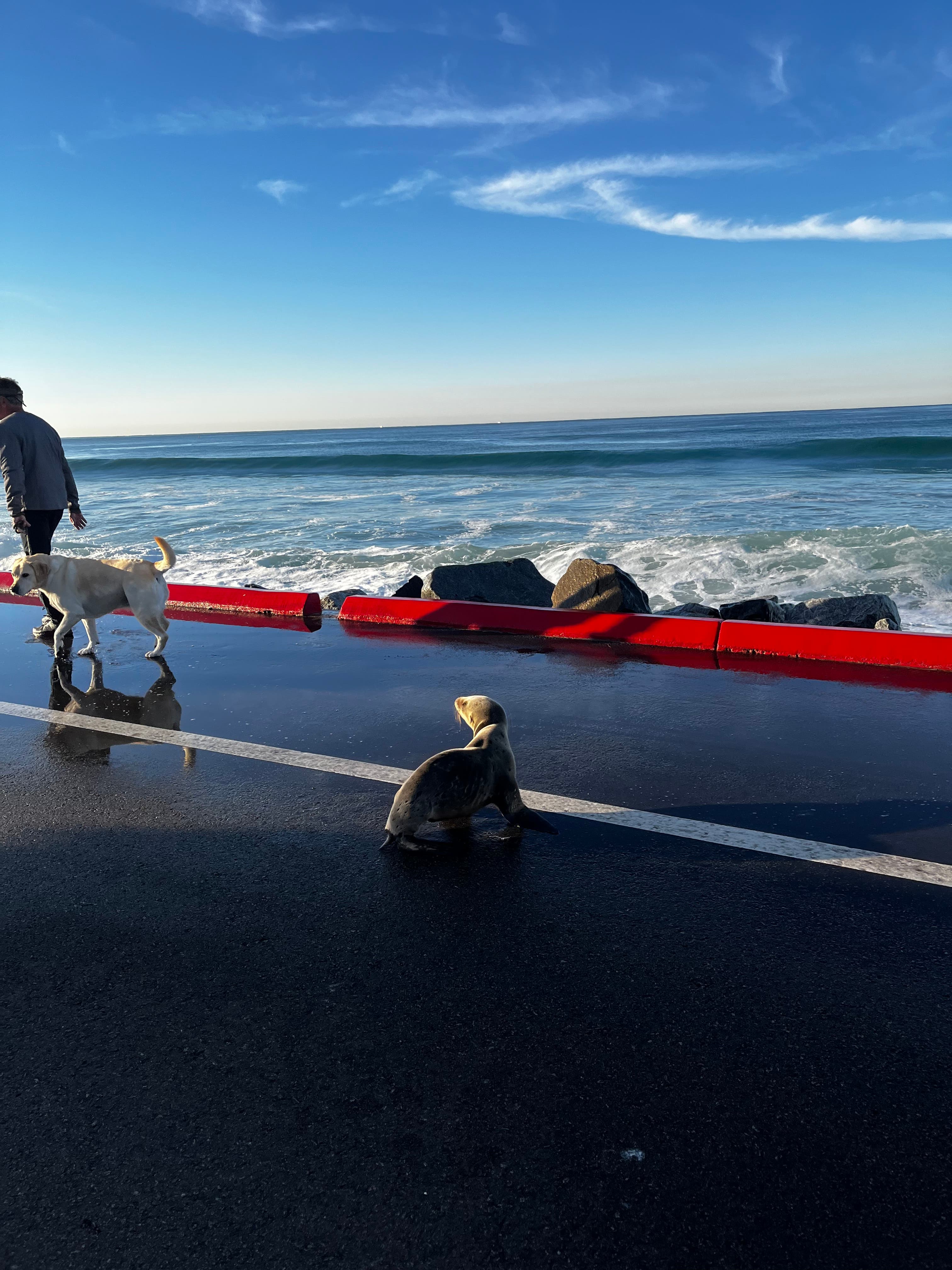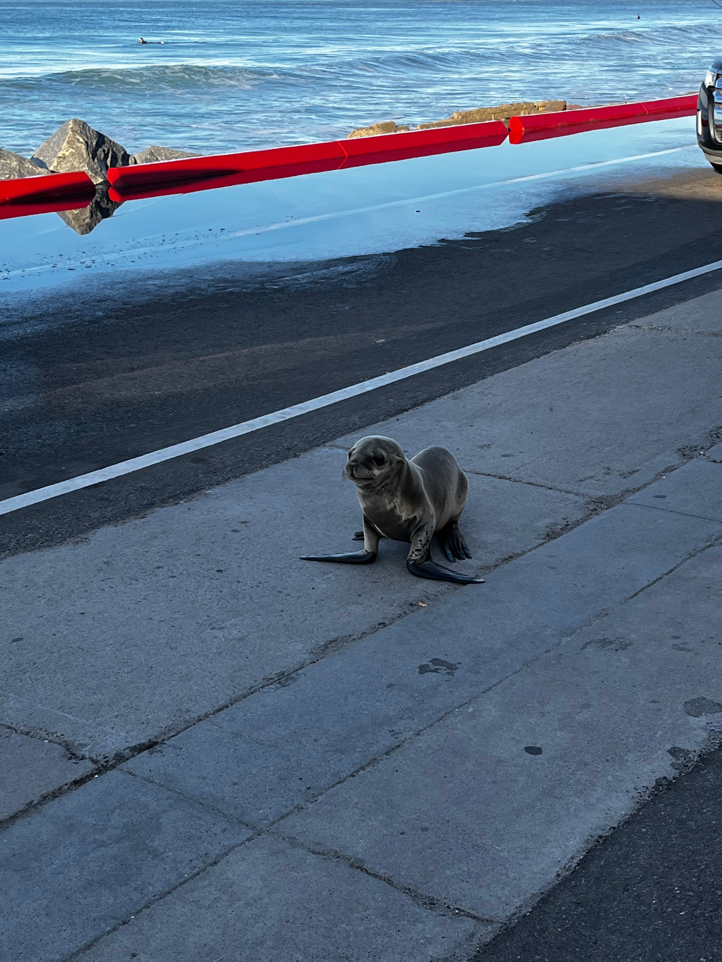 "There was this adorable baby sea lion wandering on the strand holding up traffic. It caused quite the spectacle. After about 20 minutes and several bystanders helping it to safely it went back over the rocks into the water area."