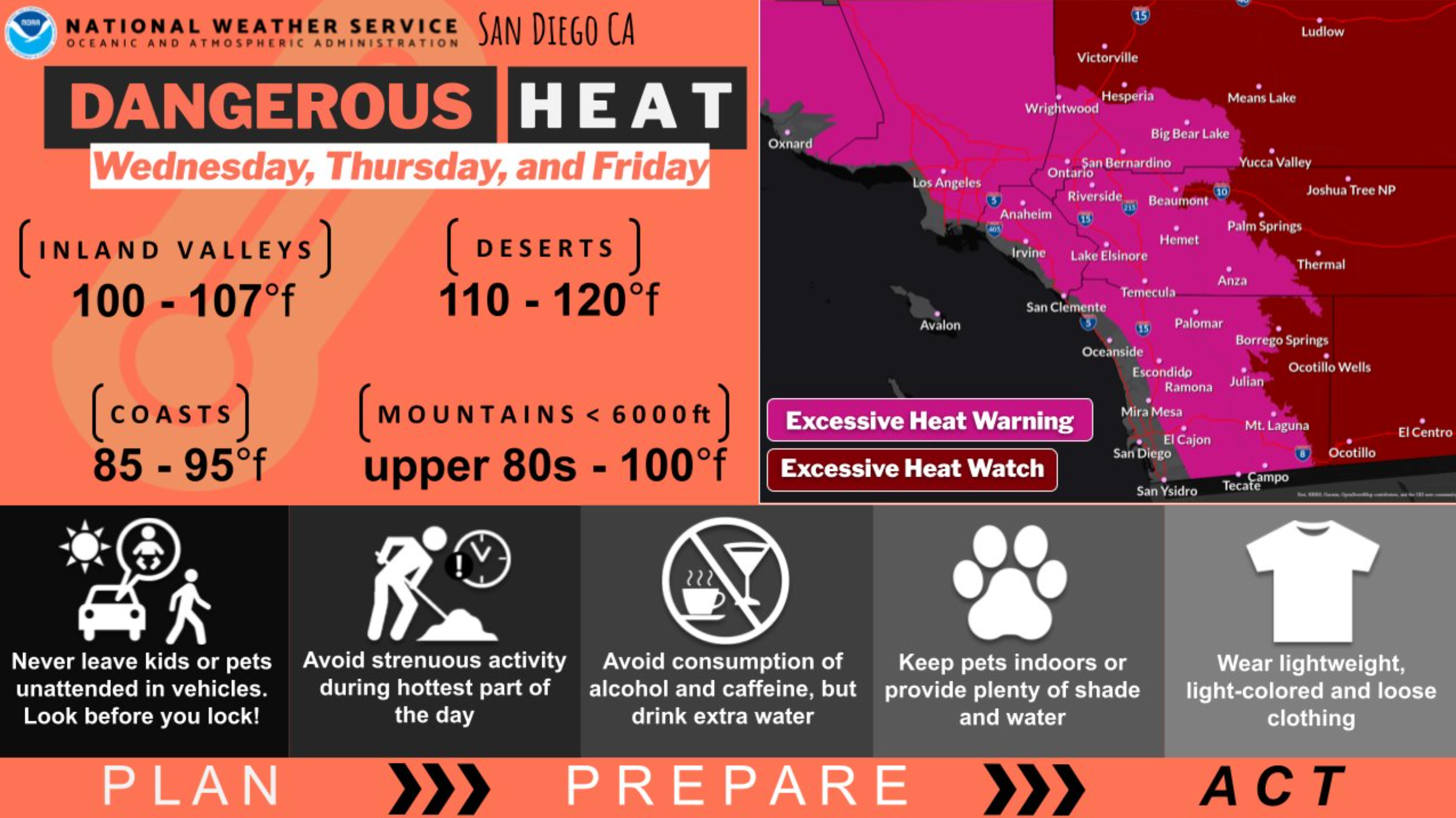 An Excessive Heat Warning has been issued by @NWSSanDiego for 11AM Wed (Sep 4) to 8PM Fri (Sep 6). Have a plan to stay cool & check in regularly with vulnerable people in case they need help staying cool. Learn more at https://t.co/1PC1tFZEyy. #ReadyRiverside pic.twitter.com/jgoelpZfCU