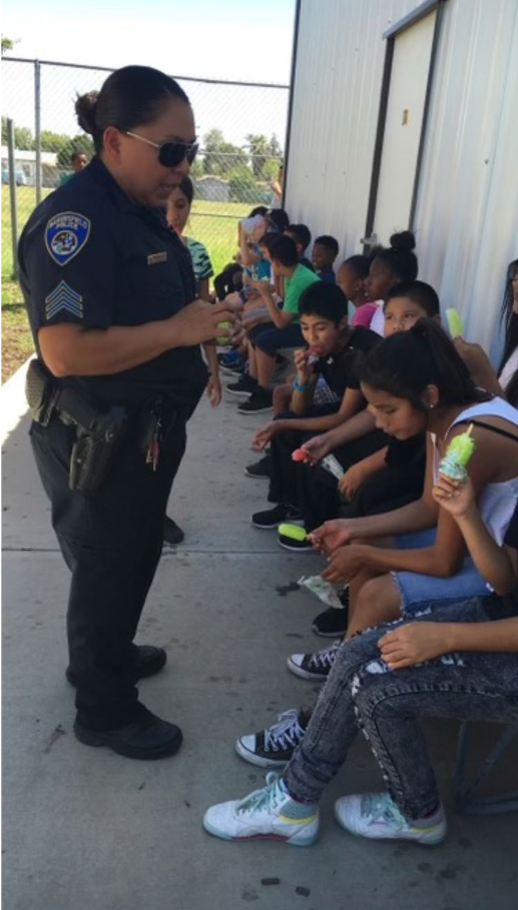 Marcela enjoys speaking with local children to share her experience in law enforcement.