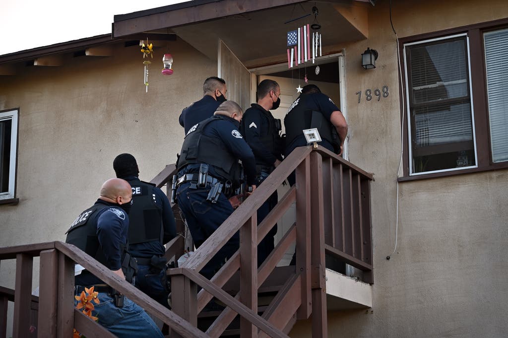 Santa Ana Police serve a search warrant on the home of Dillon Nguyen of Westminster after taking him into custody on suspicion of posting ‘revenge porn’ of underage girl. No one else was home and police were able to enter without incident. The address number on the wall was blurred for privacy reasons.