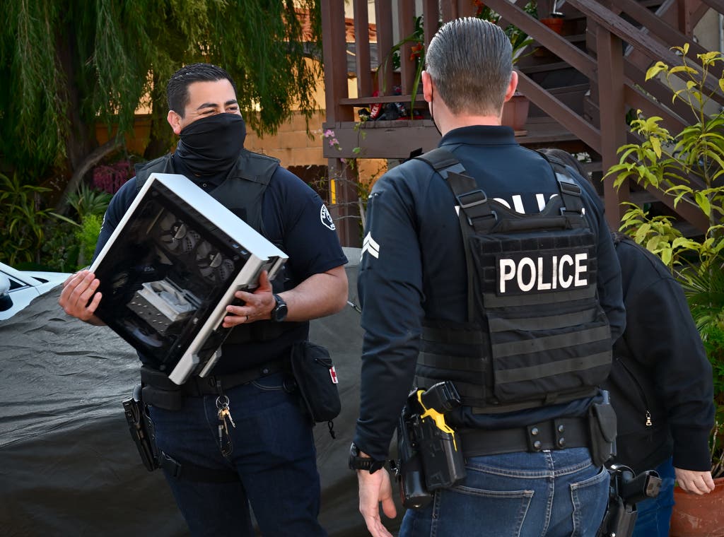 Santa Ana Police Officer Gerardo Corona with a computer belonging to Dillon Nguyen of Westminster that was obtained through a search warrant.