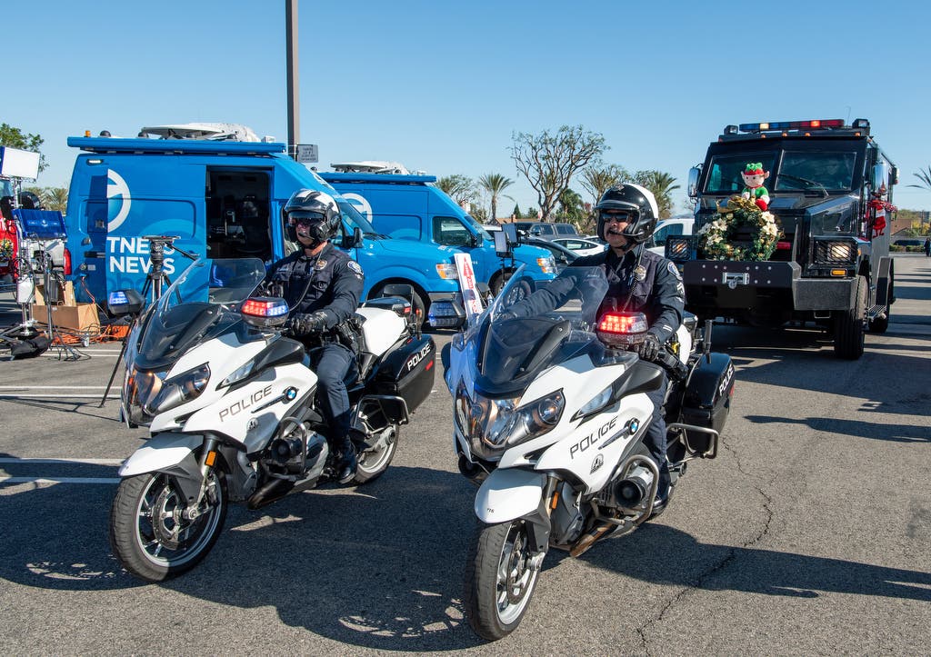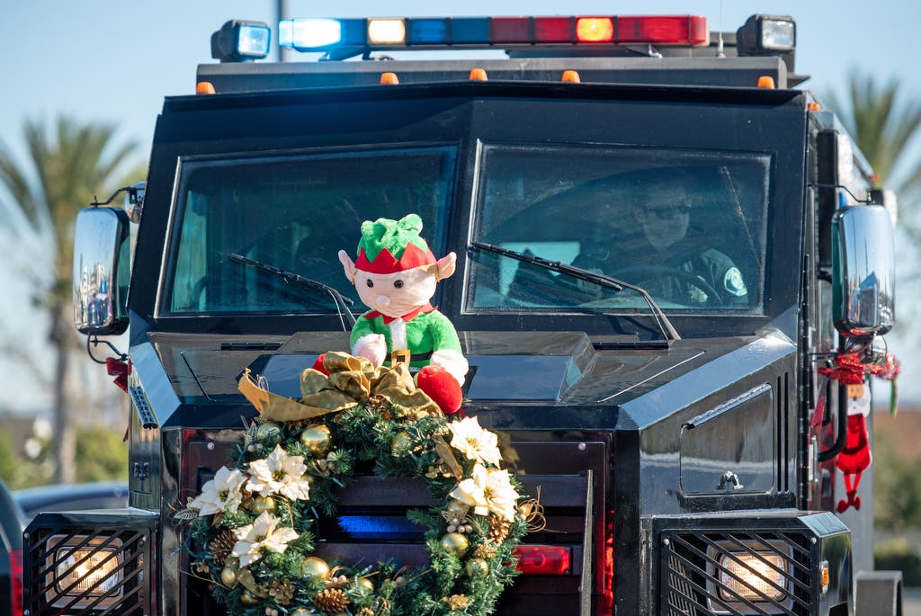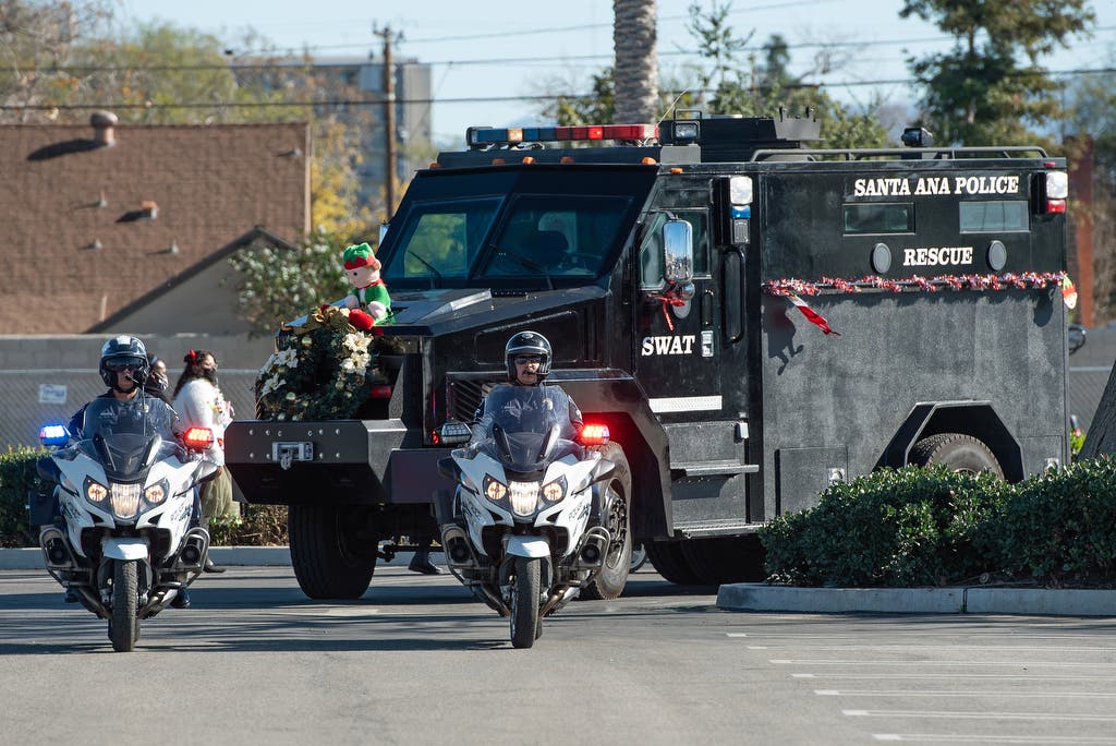 Santa’s sleigh arrived early at Santa Ana College, in the form of a Santa Ana Police Department Bearcat SWAT vehicle. The pair of motorcycles that led the procession served as Santa’s reindeer.