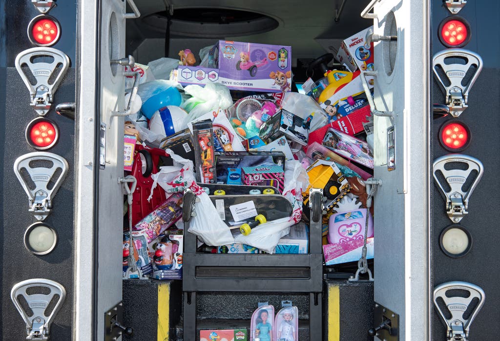 Two lines of police officers, firefighters, and several volunteers formed and began transferring the trove of toys to two waiting buses, nearly filling both.