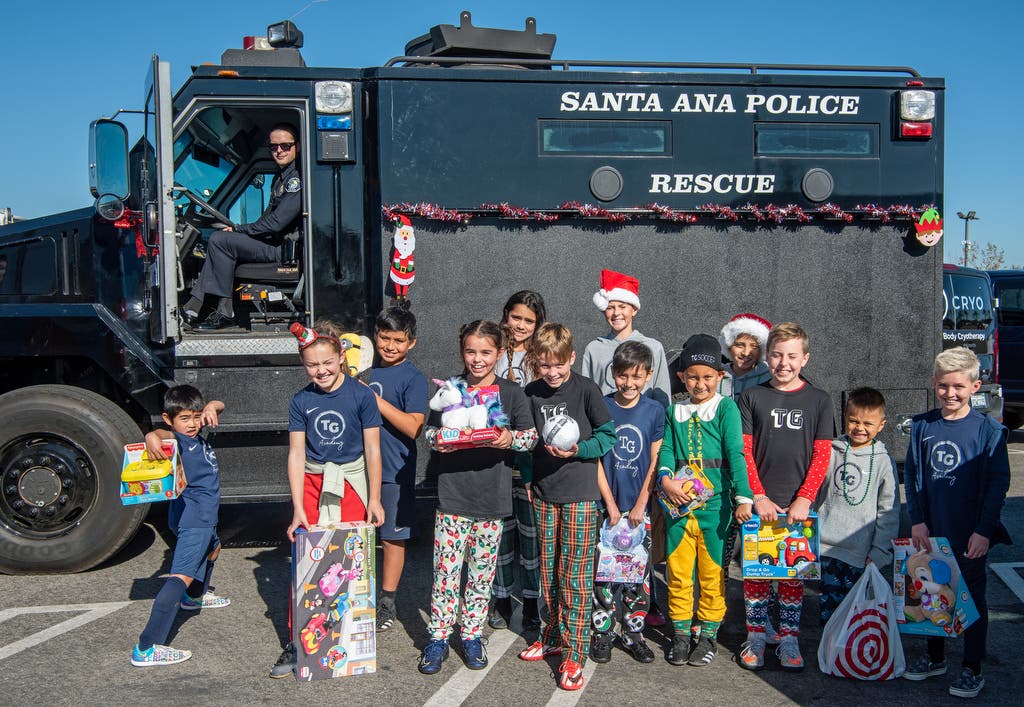 “Ooh, neat,” exclaimed a boy from the Touch and Go Soccer Academy of Tustin, which was on hand delivering toys, when the back doors of “Bear” were opened to reveal its stash.