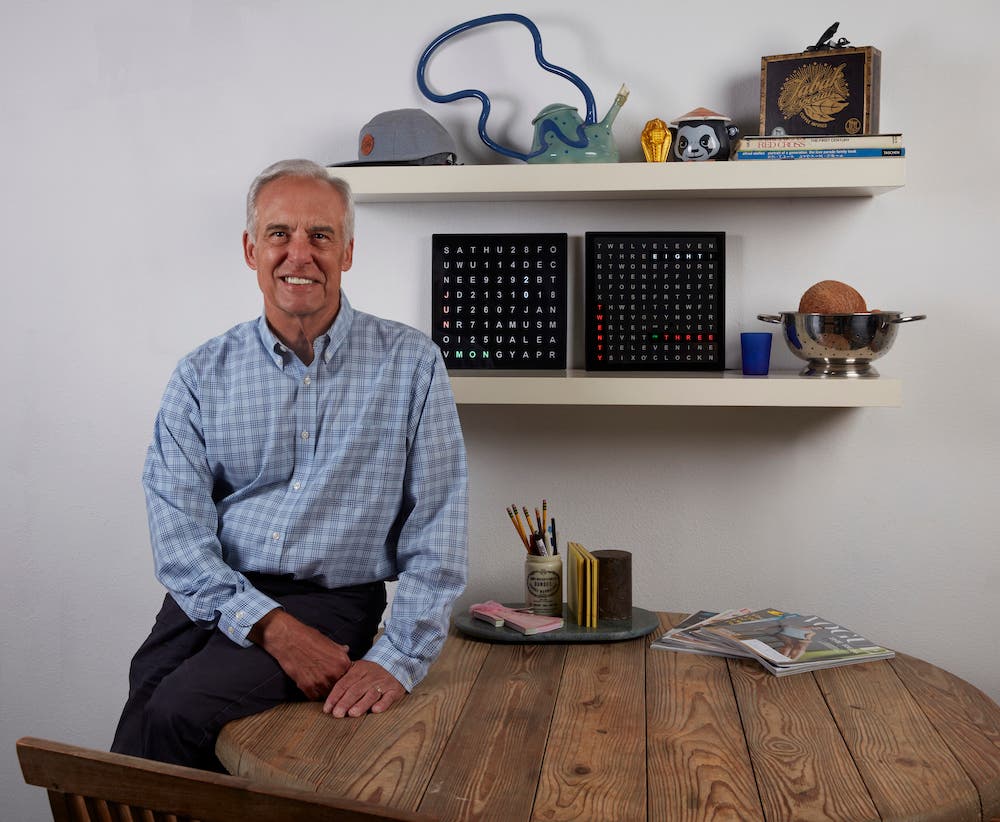 Bob rebooted his Crossword Calendar and upgraded the design from a no-tech plexiglass construction to a modern digital design with LED letters and numbers arranged across and down — just like a regular crossword puzzle.