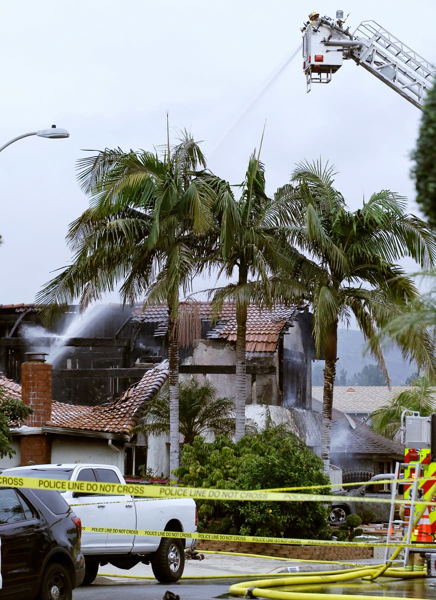 Firefighters work the scene of a deadly plane crash in the residential neighborhood of Yorba Linda, California.