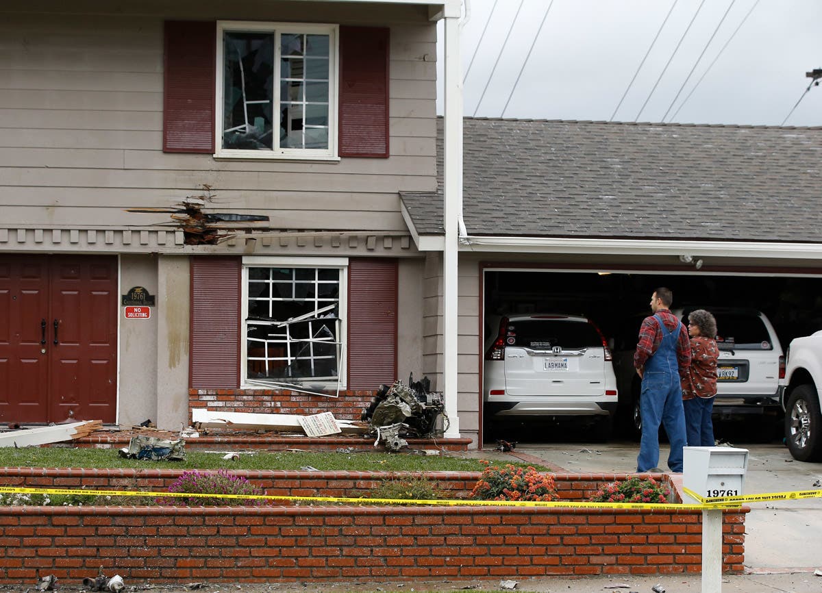 Residents look at the debris that hit their home after a small plane crashed into the residential neighborhood of Yorba Linda, California.