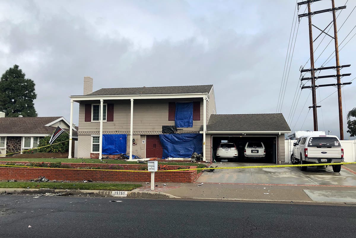 Damage and debris from a small plane crash is shown in front of the home in Yorba Linda, California.