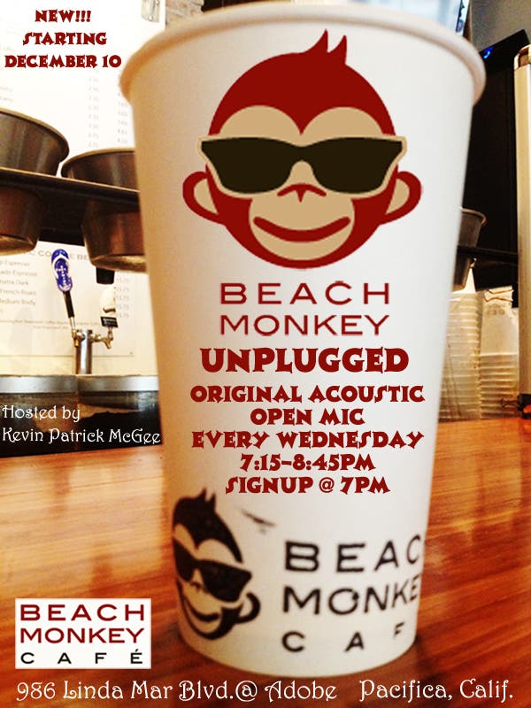 You are invited to share some of your original tunes or support live original music as a listener at a new acoustic open mic in Pacifica hosted by Kevin Patrick McGee every Wednesday evening at the cozy, intimate Beach Monkey Café. All acoustic (no amplification), all originals (no covers), all ages.